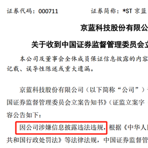 《立案告知书》显示,因涉嫌信息披露违法违规,根据《中华人民共和国证券法》《中华人民共和国行政处罚法》等法律法规,中国证监会决定对*ST京蓝立案。