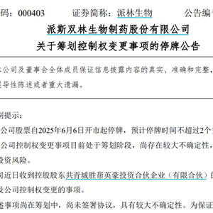 6月5日晚间,派林生物发布公告称,公司控股股东正在筹划涉及公司控制权变更的事项。为保证公平信息披露,维护投资者利益,公司股票自2025年6月6日开市起停牌。