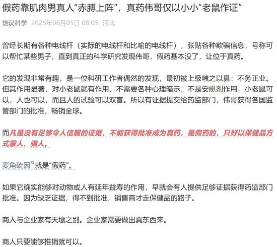 6月5日,前首都医科大学校长,现任北京大学校务委员会副主任、理学部主任、生物学讲席教授饶毅在个人公众号“饶议科学”上发布了题为《假药靠肌肉男真人“赤膊上阵”,真药伟哥仅以小小“老鼠作证”》的文章。文中“董事长裸男展示肌肉”“麦角硫因”、肌肉截图影射科伦药业董事长刘革新的近期代言。