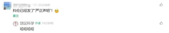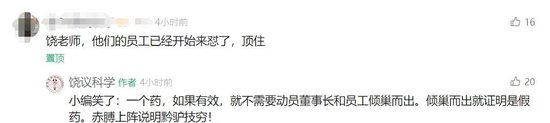 有网友将科伦永年大健康已回复这一信息同步至饶毅的留言区,饶毅回复“哈哈哈哈”“小编笑了:一个药,如果有效,就不需要动员董事长和员工倾巢而出。倾巢而出就证明是假药。赤膊上阵说明黔驴技穷!”,并将几条网友留言置顶。