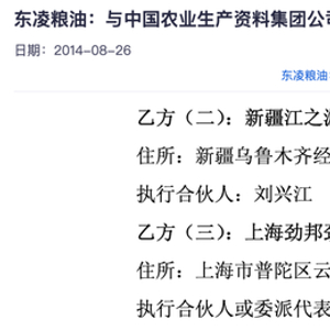 当时,亚钾国际(曾用名“东凌粮油”)计划收购中农国际100%股权,以此转型至钾肥业务。交易对方包括上海劲邦劲德股权投资合伙企业(有限合伙),彭志云当时是其执行事务合伙人委派代表。