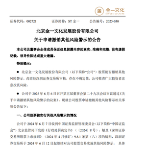 6月6日晚间,北京金一文化发展股份有限公司(以下简称“ST金一”,证券代码:002721)发布关于申请撤销其他风险警示的公告。不过公司能否撤销其他风险警示,尚需经深圳证券交易所审核,存在不确定性。