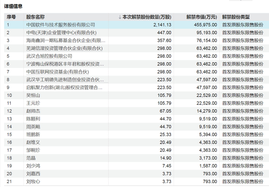 在下周面临解禁的43只股票中,解禁市值最大的达梦数据解禁股东为中国软件与技术服务股份有限公司、中电(天津)企业管理中心(有限合伙)、海南鑫润一期私募基金合伙企业(有限合伙)等21个股东。其中,中国软件与技术服务股份有限公司为达梦数据第一大股东。