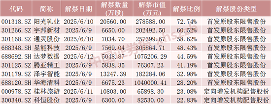 Wind数据显示,在下周面临解禁的43只股票中,有7只股票解禁股数量占总股本比例超过30%,分别为阳光乳业、宇邦新材、通灵股份、昱能科技、达梦数据、腾亚精工、泽宇智能,解禁比例分别为72.74%、60.52%、58.62%、48.43%、44.59%、41.19%、32.98%。与当前流通股相比,这7只股票下周解禁后流通盘将分别增加266.81%、153.35%、141.68%、93.92%、222.93%、99.00%、129.46%,其中有5只股票解禁后流通盘将增加超100%。