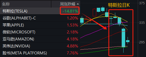 Wind数据显示,在美股走强、科技七巨头指数上涨的背景下,特斯拉本周大跌近15%,市值蒸发超千亿美元。