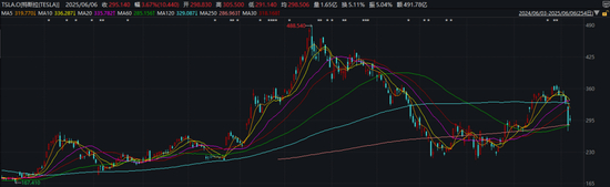 去年12月18日股价见顶(最高488.54美元)后,特斯拉的震荡下跌趋势一路延续到今年3月,最低跌至215美元附近;原本4月企稳、5月反弹的势头,在本周戛然而止。