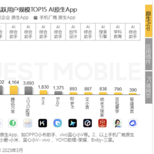 但市场数据表明三六零的AI布局尚需提升。用户规模方面,QuestMobile数据显示,截至今年3月,原生App端已出现四个亿级规模应用,分别为DeepSeek、小艺、小布助手及豆包。在活跃用户规模TOP15原生App中,纳米AI搜索以838万月活排名第十二位。与DeepSeek和豆包亿级规模相比,差距明显。