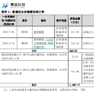 具体来看,3月28日,陈珍作为原告起诉惠程科技,涉案金额221.40万元。4月14日,黎桂起诉惠程科技及其中介机构上会会计师事务所(特殊普通合伙),涉案金额229.55万元,两项合计450.95万元,案件均已立案但尚未开庭审理。