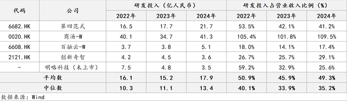 2022-2024年,深演智能的研发开支分别为4,687万元、5,406万元及5,634万元,仅占总收入的8.6%、8.8%及10.5%。深演智能在招股书中多次表示“领先的研发实力,驱动我们的AI创新引擎”;”我们的技术实力超越理论”;“我们走在AI能力的前沿”。按照深演智能的表述,其研发费用或研发费用率应该比同行高,尤其是在AI行业蓬勃发展的趋势下应该保持增长的趋势。然而,公司研发费用及费用率远低于AI行业其他公司水平(2024年可比公司平均研发投入约17.9亿元,占营业收入比例约49.3%)。当同行业公司纷纷加大AI研发以期望提高技术壁垒、提升产品/服务效果、抢占市场份额时,让人怀疑深演智能较低的研发水平,是否能持续为客户提供高质量的AI决策及营销服务。