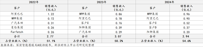 2022 -2024年,深演智能来自前五大客户的收入分别为2.77亿元、3.07亿元及2.94亿元,分别占相应年度总收入的 51.1%、50.2%及54.6%。结合公司A股招股书信息,虽然近3年前五大客户收入占比较2020年、2021年超70%的水平有一定程度的改善,但公司仍面临集中度较高的风险。