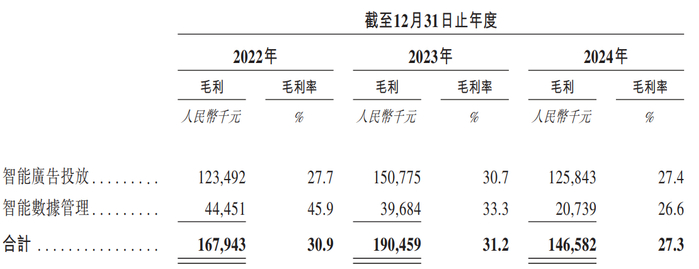 2022-2024年,深演智能的整体毛利率分别为30.9%、31.2%、27.3%;其中,智能广告投放业务的毛利率分别为27.7%、30.7%及27.4%,智能数据管理业务毛利率降幅更显著,分别为45.9%、33.3%及26.6%。公司在招股书中解释称智能数据管理业务毛利降低的原因系,由于客户的购买组合随其不断变化的需求而改变,即从购买更多的标准化系统产品转到本地化部署和运营维护服务。在宏观环境压力下,深演智能的客户结构从“高价值产品采购”向“低价值服务维持”的被动转向,这一趋势若持续,将对长期盈利能力构成严峻挑战。