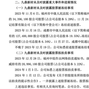 2023年11月,福州中院裁定冻结了深圳翼威新材料有限公司(简称“深圳翼威”)持有的九鼎新材5.28%股份;当月,成都中院又裁定冻结了深圳翼威、西安正威新材料有限公司(简称“西安正威”)持有的九鼎新材股票,分别占九鼎新材总股本的19.55%、6.34%。不晚于2023年12月19日,九鼎新材知悉前述股票被冻结事项。直至2024年1月12日,九鼎新材才发布公告,一并披露上述股票被冻结等事项。