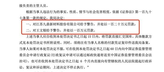 江苏证监局认定,九鼎新材上述行为违反了有关法律法规。综合上述事实,江苏证监局决定对九鼎新材处罚款120万元,并给予警告;对王文银给予警告,并处以100万元罚款。