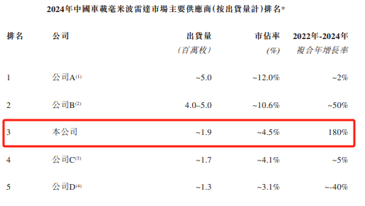 根据公司招股书,承泰科技是中国国内最大车载前向毫米波雷达供应商,而按出货量计,公司是中国第三大车载毫米波雷达供应商,市场份额分别为9.3%及4.5%(该数据排除了主要为满足内需而非更广泛的市场需求成立的OEM联属公司)。