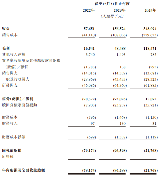 2022-2024年,承泰科技的营业收入虽呈增长态势,分别为0.58亿元、1.57亿元和3.48亿元,2024年同比增长122.4%;但净亏损却依旧存在,分别为-7,914万元、-9,660万元、-2,177万元,2024年同比收窄77.5%。公司在招股书中解释持续亏损的原因,主要由于往绩期间授予过往年度若干轮次融资的投资者的赎回负债产生的赎回责任的大笔账面值变动以及经营开支等。