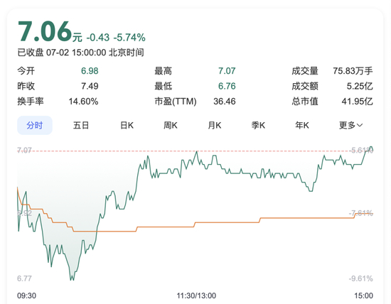 7月2日,百川股份股价大跌。截至当日收盘,百川股份下跌5.74%,每股报7.06元,总市值41.95亿元。