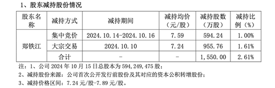 同样是2024年10月,因个人资金需求,郑铁江减持了1550万股公司股份,减持比例为2.61%,对应市值约1.14亿元。