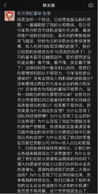引起广泛关注的是,就在李卫国宣布首次减持前三个月,东方雨虹董秘张蓓的一则朋友圈火了,她发出“灵魂11问”,大意为:公司估值已经这么低了,房地产影响在减弱,非房业务在向好,股价居然还在“坑里”呆着。