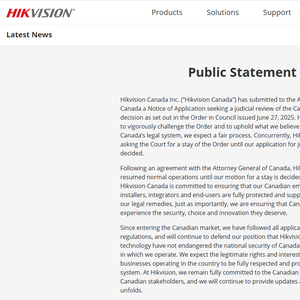 海康威视7月7日发布公告称,海康威视加拿大公司已向加拿大总检察长提交申请,寻求对加拿大政府停止其在加所有业务的决定进行司法审查。声明称,在与加拿大总检察长达成协议后,海康威视加拿大公司已恢复正常运营,直至法院对公司提出的暂缓执行申请作出裁决。