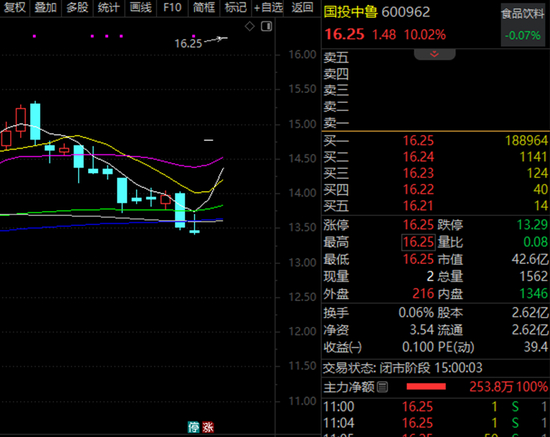 国投中鲁(600962)则是连续两天“一”字涨停,昨天换手率0.15%,今天换手率进一步降低至0.06%,表明筹码处于极度惜售中。