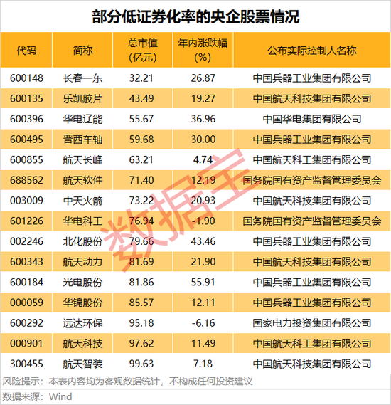 据民生证券研报,航天科工集团、航天科技集团、兵器工业集团等3家央企资产证券化率均不足30%。另据华源证券研报,华电集团、国家电投集团等电力央企资产证券化率不足40%。