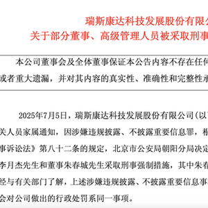 瑞斯康达7月7日晚披露,公司收到相关人员家属通知,公司董事长兼总经理李月杰、董事朱春城因涉嫌违规披露、不披露重要信息罪被北京市公安局朝阳分局采取刑事强制措施,朱春城已被取保候审。经向有关部门了解,公司得知上述涉嫌违规披露、不披露重要信息的事项,与2023年9月中国证监会对公司作出的行政处罚系同一事项。