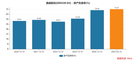 从近三年年报及 Wind 数据维度观察,通威股份负债规模上演 “指数级膨胀” 戏码:2022 年末,负债规模为 719.99 亿元;步入 2023 年末,攀升至 905.34 亿元,同比增幅达 25.7% ;到 2024 年末,进一步飙升至 1379.98 亿元,相较 2023 年末,涨幅高达 52.4% ;