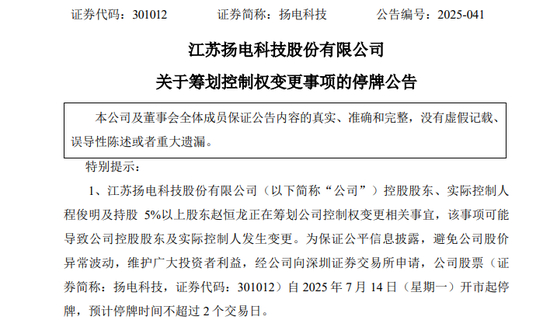 同在7月13日,另一家上市公司扬电科技也宣布筹划控制权变更事项,并将于7月14日停牌。