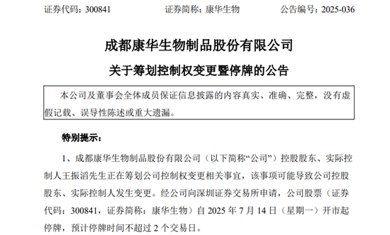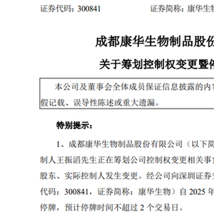 康华生物公告显示,公司于7月11日收到控股股东、实际控制人王振滔通知,其正在筹划公司控制权变更相关事宜,该事项可能导致公司控股股东、实际控制人发生变更。