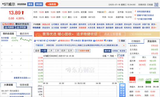 7月16日,*ST威尔涨停,收盘价为13.89元。