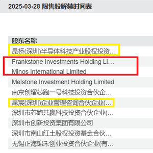 wind显示,2025年3月28日,星宸科技有14,869.15万股股票获得解禁,占总股本的35.31%,解禁的股东包括石誠投資(Frankstone)、Minos International Limited、(下称“Minos”)、昆桥资本及其一致行动人昆宸(深圳)企业管理咨询合伙企业(有限合伙)(下称“昆宸”)等。