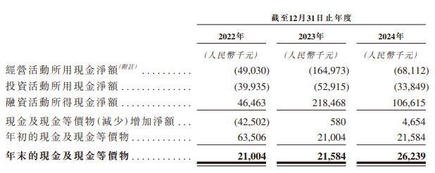 2022年至2024年,经营活动现金净流出分别为4.9亿元、16.5亿元和6.8亿元,三年累计净流出28.21亿元,核心业务造血能力持续缺失。投资活动同样“只出不进”,同期净流出4.0亿元、5.3亿元和3.4亿元。公司完全依赖融资活动维系运营,三年间融资净流入4.65亿元、21.85亿元和10.66亿元,但这种“拆东补西”的模式不可持续——2024年融资规模已较2023年腰斩,且公司的融资成本已大幅侵占其利润空间。截止2024年末,公司账上仅剩2624万现金,若上市募资不及预期,资金链断裂风险将急剧放大。