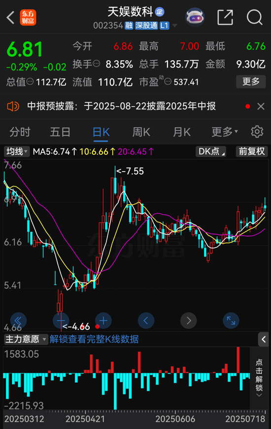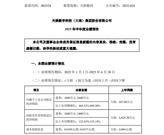 7月12日,天娱数科发布的业绩预告显示,公司预计2025年上半年的归母净利润位于1800万元至2600万元之间,同比增长369.52%至489.30%;扣非后净利润位于1600万元至2400万元之间,同比增长123.43%至135.14%。