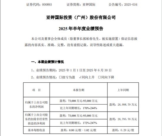 7月12日,亚钾国际发布的业绩预告显示,公司预计2025年上半年的归母净利润位于7.3亿元至9.3亿元之间,同比增长170%至244%;扣非后净利润位于7.3亿元至9.3亿元之间,同比增长172%至247%。