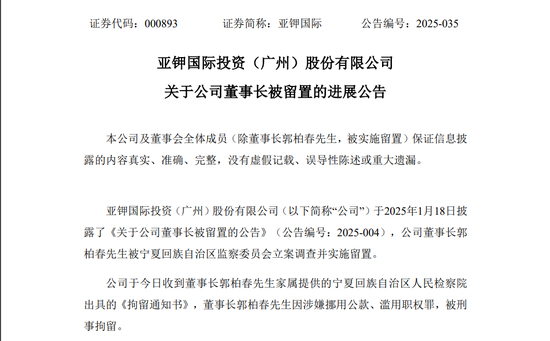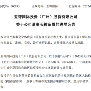 公告显示,2025年7月18日,亚钾国际、天娱数科均收到郭柏春家属通知,郭柏春因涉嫌挪用公款、滥用职权罪,被宁夏回族自治区人民检察院刑事拘留。