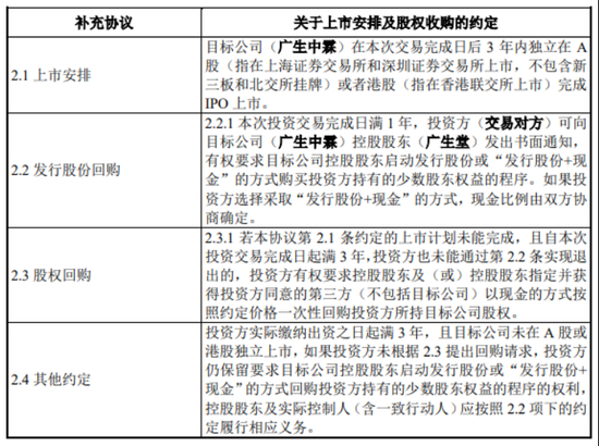 广生堂表示,补充协议中依据商业惯例设置了对投资者的保护性条款,约定若回购触发情形,交易对方可以要求上市公司承担回购义务,但该触发情形所约定的事项并非必然发生。交易对方均为投资基金,出于看好广生中霖业务发展而进行股权投资,目的是为了获取较高的股权投资回报,而不是固定收益回报。基于增资协议以及修改后的公司章程约定,交易对方实际享有广生中霖的股东权利。广生中霖从未向交易对方支付任何固定收益。增资协议中约定的现金回购义务是或有的非必然发生的事项,是交易对方投资退出的保护性措施,也符合市场通行做法。交易对方对标的公司的增资事项属于股权投资,不构成“明股实债”。