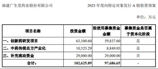 根据广生堂披露的2025年定增方案来看,创新药研发项目是广生堂此次募资后投入的大头,拟使用募集资金5.98亿元用于创新药研发项目,该项目投资金额为6.31亿元。将募集资金8849.05万元用于中药传统名方产业化项目,该项目投资金额为1.05亿元;拟使用募集资金2.9亿元用于补充流动资金。