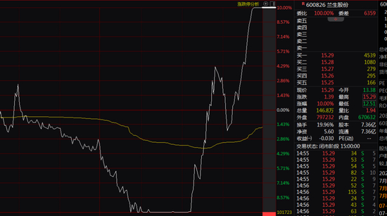 兰生股份尾盘涨停,上演“地天板”,换手率近20%,报收15.29元/股,最新市值112.5亿元。