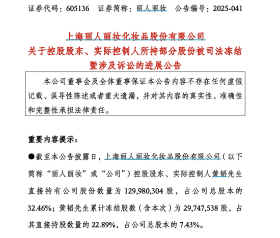 今年4月1日,丽人丽妆发布公告,宣布其控股股东兼实际控制人黄韬与前妻翁淑华之间的离婚财产纠纷案已迎来终审判决,并且该判决已正式生效。根据判决结果,黄韬需将其持有的约八分之一股份,即1675万股转让给翁淑华。