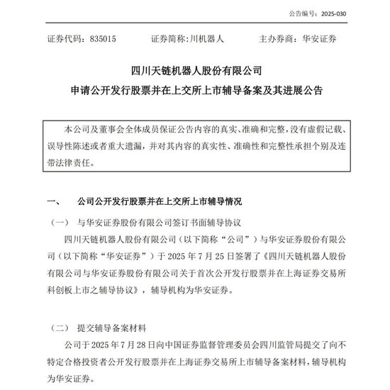 7月30日晚,四川天链机器人股份有限公司(下称“川机器人”)公告称,公司与华安证券于7月25日签署了《四川天链机器人股份有限公司与华安证券股份有限公司关于首次公开发行股票并在上海证券交易所科创板上市之辅导协议》,四川证监局于7月30日对辅导备案材料予以受理。