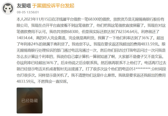 该用户称,实际还款达82334.64元,利息14034.64元,经计算利率超36%,远超24%的“高利贷”认定红线,要求返还超出费用4833.59元。用户表示,与锡商银行投诉部门沟通后,对方回访询问利率计算方式,承诺后续联系却失联,电话拨打显示关机或无法接通。