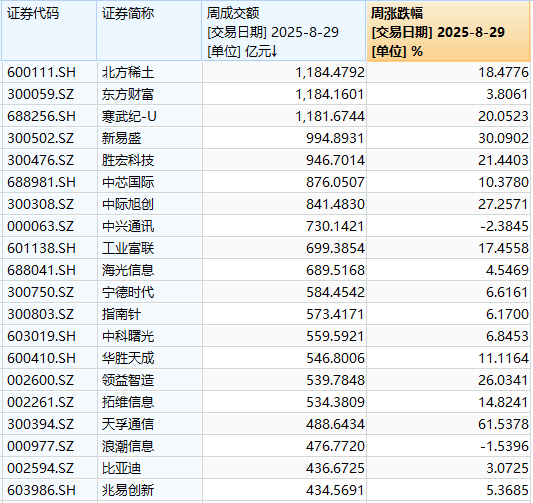 但也要注意到,本周3只成交额超千亿元的股票,分别是北方稀土、东方财富与寒武纪。这说明,在科技线之外,稀土与金融科技(券商)也有一席之地。