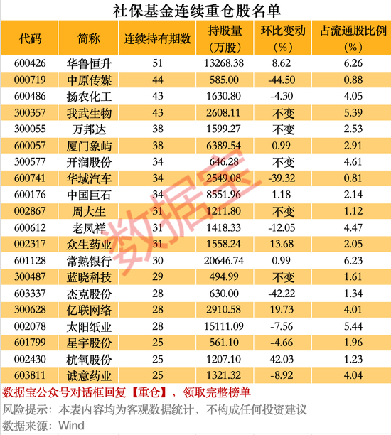 作为风格稳健的长期机构投资者,社保基金长线持有的重仓股更引人关注,据数据宝统计,共有258只股获社保基金连续持有4个季度以上。其中,160只社保基金持有期超过两年,华鲁恒升、中原传媒等46只获社保基金连续持仓超5年。