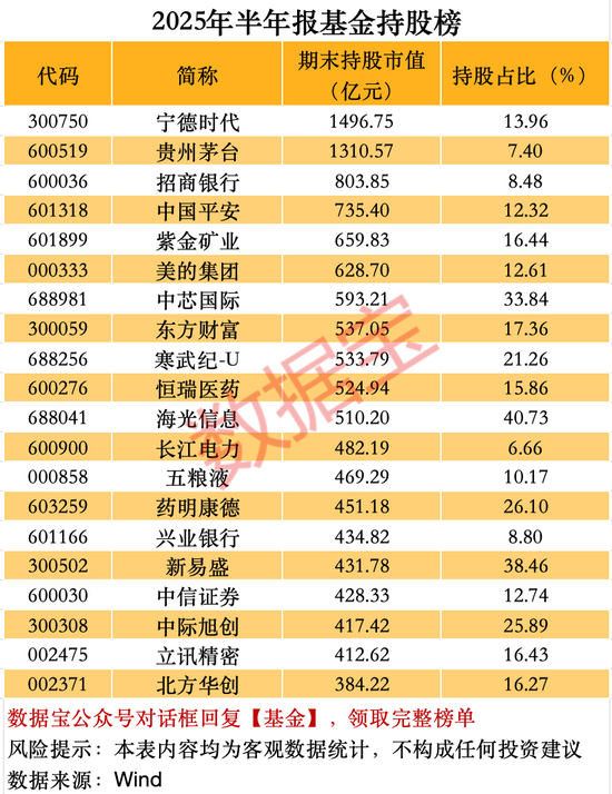 数据宝统计的《2025年半年报基金持股榜》显示,117股获公募基金持股市值逾百亿元。宁德时代、贵州茅台稳坐排行榜的冠亚军席位。