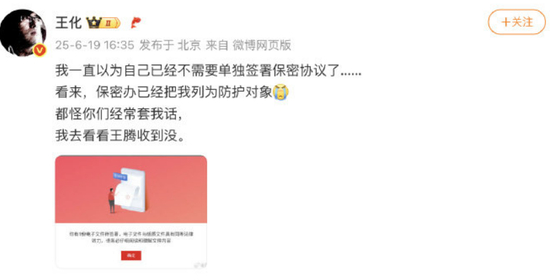 2025年6月19日,王化曾发博表示,“我一直以为自己已经不需要单独签署保密协议……看来,保密办已经把我列为防护对象。都怪你们经常套我话,我去看看王腾收到没。”随后,他在评论区表示,“刚刚去看了下,他也收到了!放心了!”