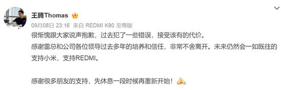 8日深夜,王腾在微博发文称,“很惭愧跟大家说声抱歉,过去犯了一些错误,接受该有的代价。感谢雷总和公司各位领导过去多年的培养和信任,非常不舍离开。未来仍然会一如既往地支持小米,支持REDMI。感谢很多朋友的支持,先休息一段时间再重新开始!”