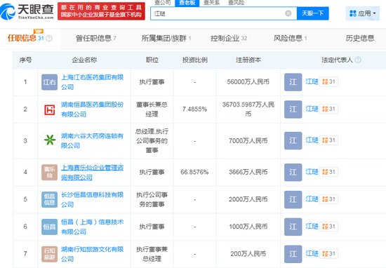 风险信息显示,江琎担任法定代表人的恒昌医药、湖南六谷大药房连锁有限公司有多条涉案信息,其中在今年4月1日,恒昌医药曾起诉广东健芝岛药房连锁有限公司,案由为著作权权属、侵权纠纷。