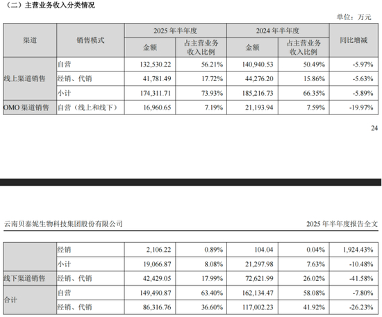 从销售渠道来看,公司主要通过线上、线下及OMO(线上融合线下)三类渠道开展业务。2025年上半年,线上渠道收入17.43亿元,同比下降5.89%;线下渠道收入4.24亿元,同比下降41.58%;OMO渠道收入1.91亿元,同比下降10.48%。三大渠道全面承压,尤其线下渠道受消费场景变化冲击最为严重。