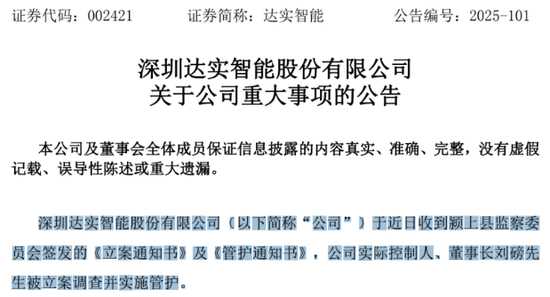 日前,达实智能(002421.SZ)发布公告称,公司实控人兼董事长刘磅被立案调查并实施管护。公司称尚未知悉此次立案调查的进展及结论。