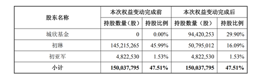 本次股份转让完成后,初琳仍持有新亚强5079.50万股,占公司总股本的16.09%,其一致行动人初亚军持有新亚强482.25万股,占公司总股本的1.53%。二者合计持有5561.75万股,持股比例为17.61%。